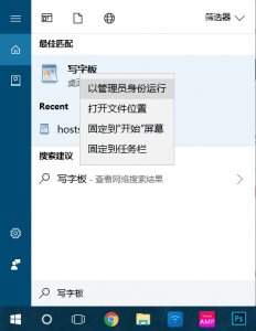 以Win10为例,在Cortana搜索框中搜索写字板,在写字板上点鼠标右键,选择以管理员身份运行:
