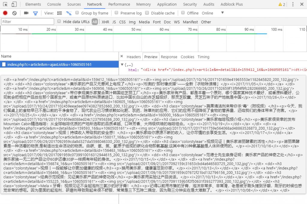 然后将网页向下滚动,直到自动加载下一页。这时,Network选项卡中就会检测到新的网络请求,点击改请求,在右侧的Preview选项卡中可以看到正是下一页的数据,将这些数据复制到一个文本文件中保存好。