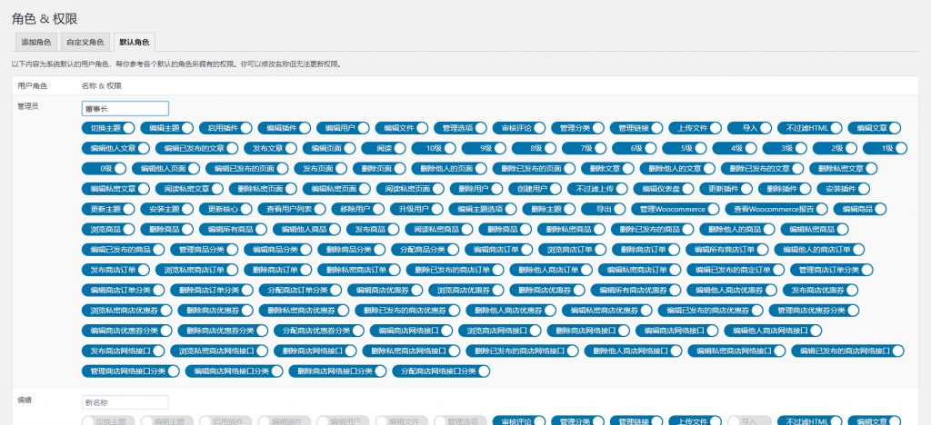 默认角色 中不仅可以用来参考用户权限,还可以方便地修改默认角色的名称。