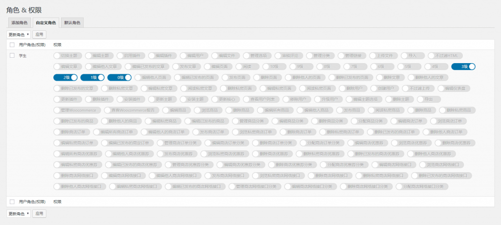 然后切换到自定义角色选项卡,就可以给新用户角色赋予权限了,也可以在这里删除用户角色,需要注意的是,只有在勾选了角色名前面的多选框才会修改其权限。