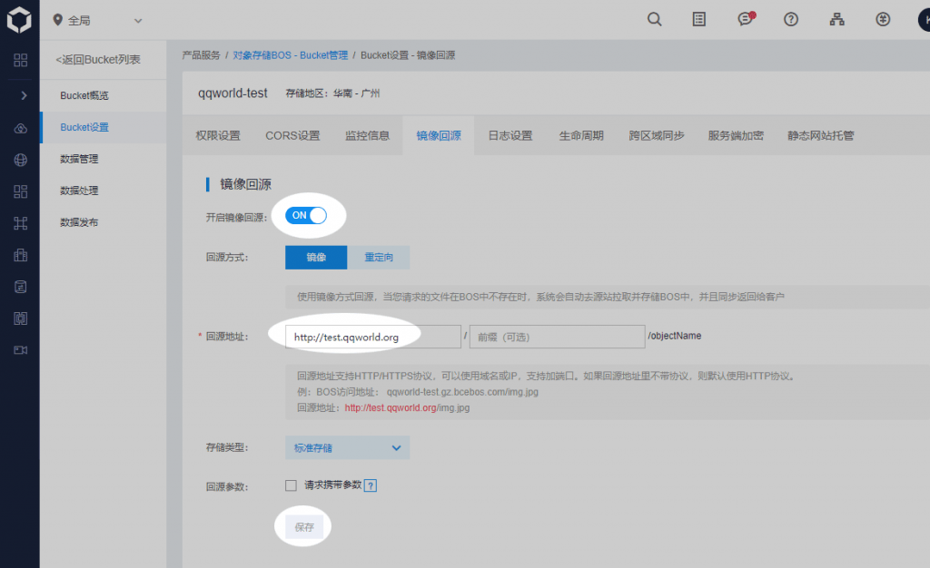 在 Bucket设置 - 镜像回源 中填写网站的首页地址即可。