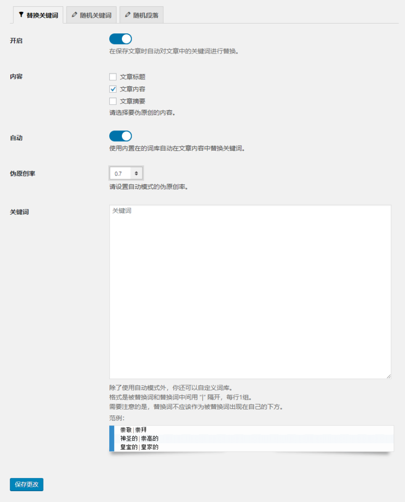 在伪原创菜单中可以全局启用伪原创,启用后保存文章时即可对文章的内容的高频关键词进行替换。