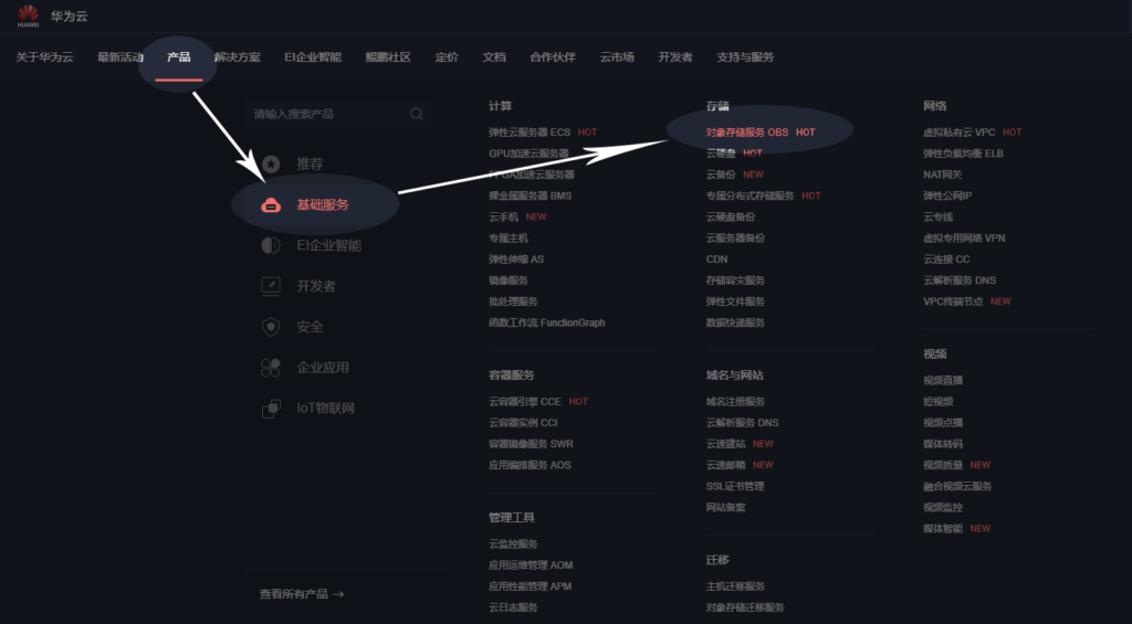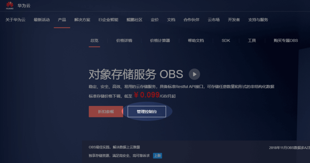 进入华为云中的对象存储OBS首页,开通华为云OBS对象存储服务。