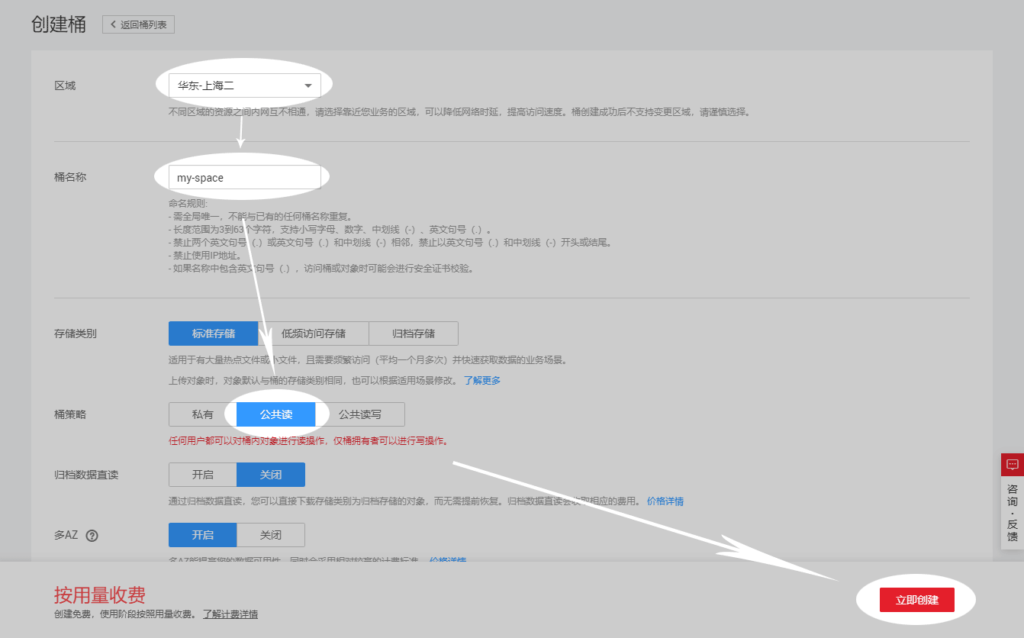 按照你的网站受众用户所在区域选择所属区域 ,填写桶名称,读写权限选择公共读。