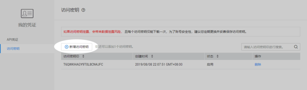 在 访问密钥 中点击 新增访问密钥 按钮,伴随密钥的建立,会下载一个文件,该文件中包含 AK 和 SK。