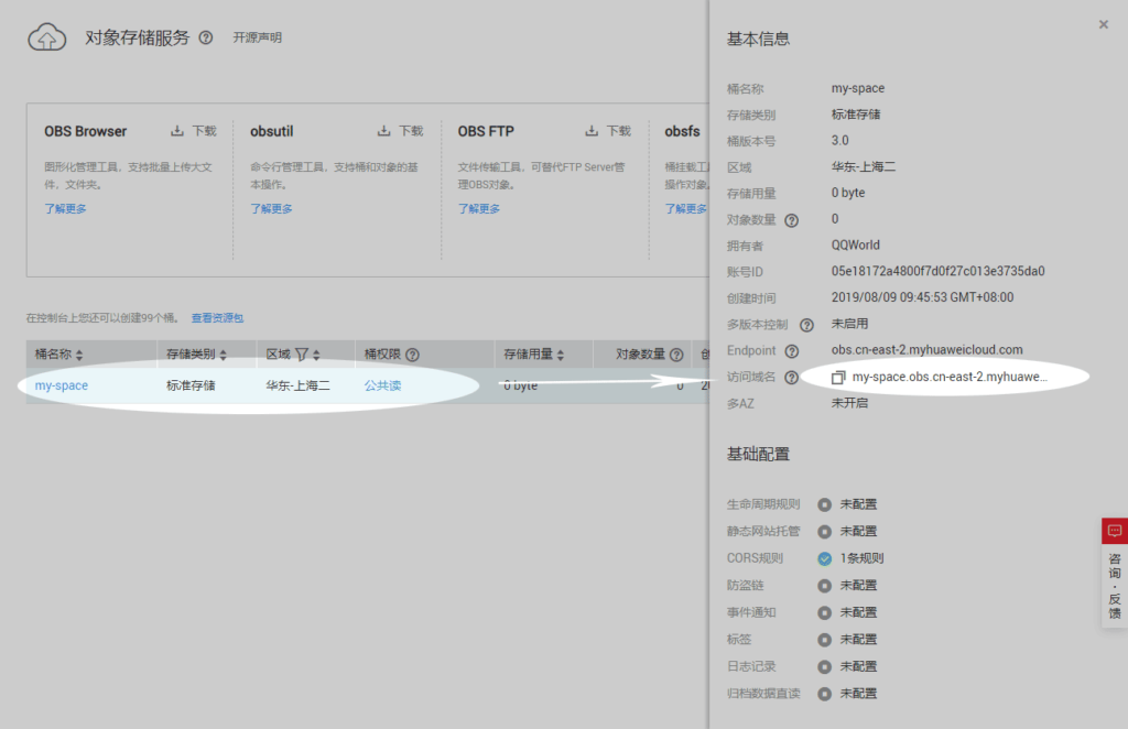 再次回到OBS控制台首页,点击新建好的存储桶,在右侧弹出了对话框中可以找到访问地址,当然你也可以绑定自己的CDN域名。