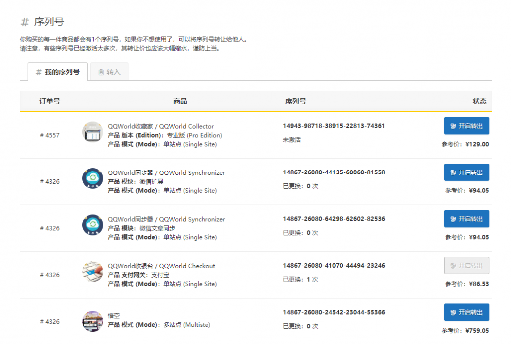 通过转出功能,不仅可以方便转手,还可以实现合买和分销操作哦!转出序列号。