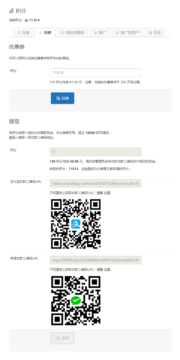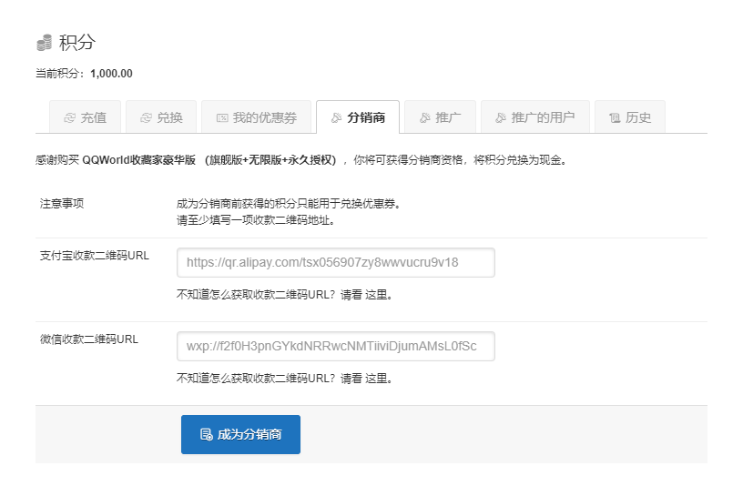 在 积分 中找到 分销商,填写你的支付宝和微信的收款二维码URL。