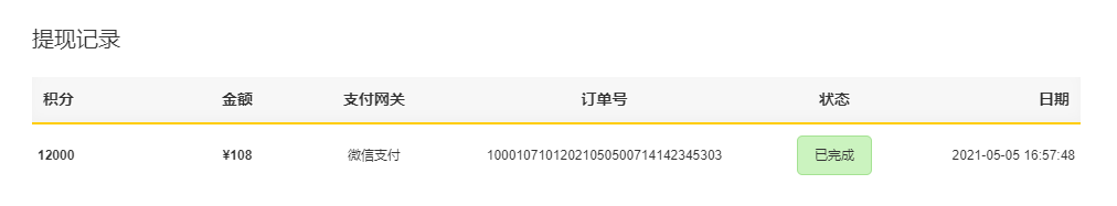 管理员给你付款后,提现记录会变成绿色的已完成状态,并且可以看到使用的支付网关以及付款订单号。